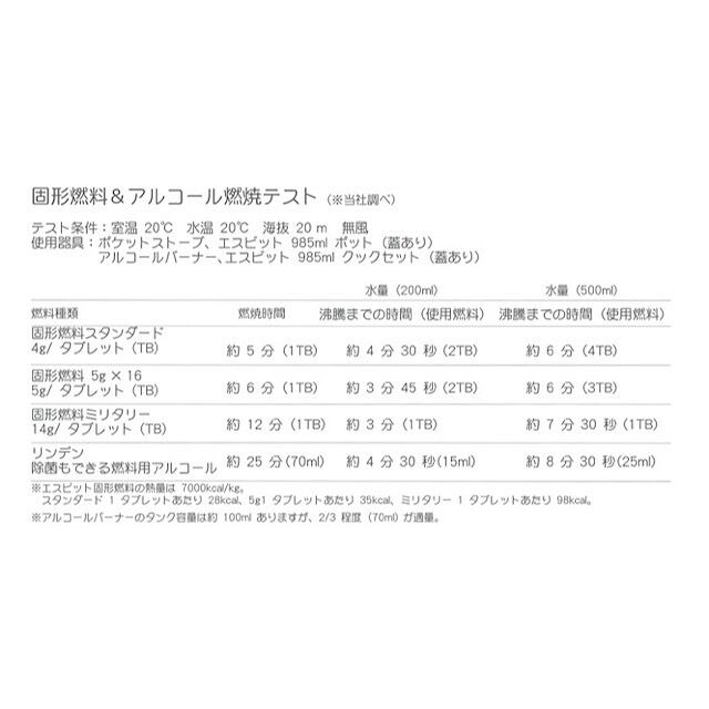 エスビットの固形燃料は高山や氷点下でも安定した炎で燃え、熱効率7,000kcal/kgとよく熱を発生し、煙をたてず、燃えかすを殆ど残さずに燃焼します。